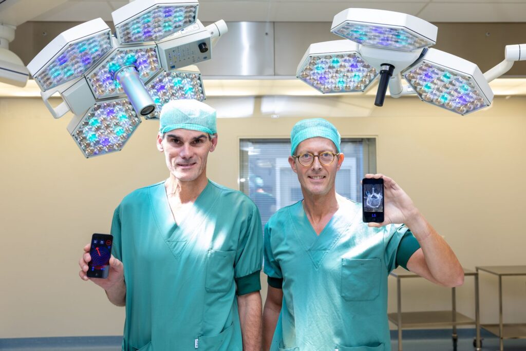 Met een mobiele telefoon tijdens de operatie de juiste positie bepalen voor het plaatsen van de schroeven in de wervels? Neurochirurgen Mark Arts en Jasper Wolfs van HMC hebben bewezen dat dit mogelijk is. In een wetenschappelijk artikel beschrijven ze deze veelbelovende nieuwe navigatietechniek die de sleutel kan zijn voor het verminderen van straling op de operatiekamer en het gebruik van minder kostbare navigatietechnieken.