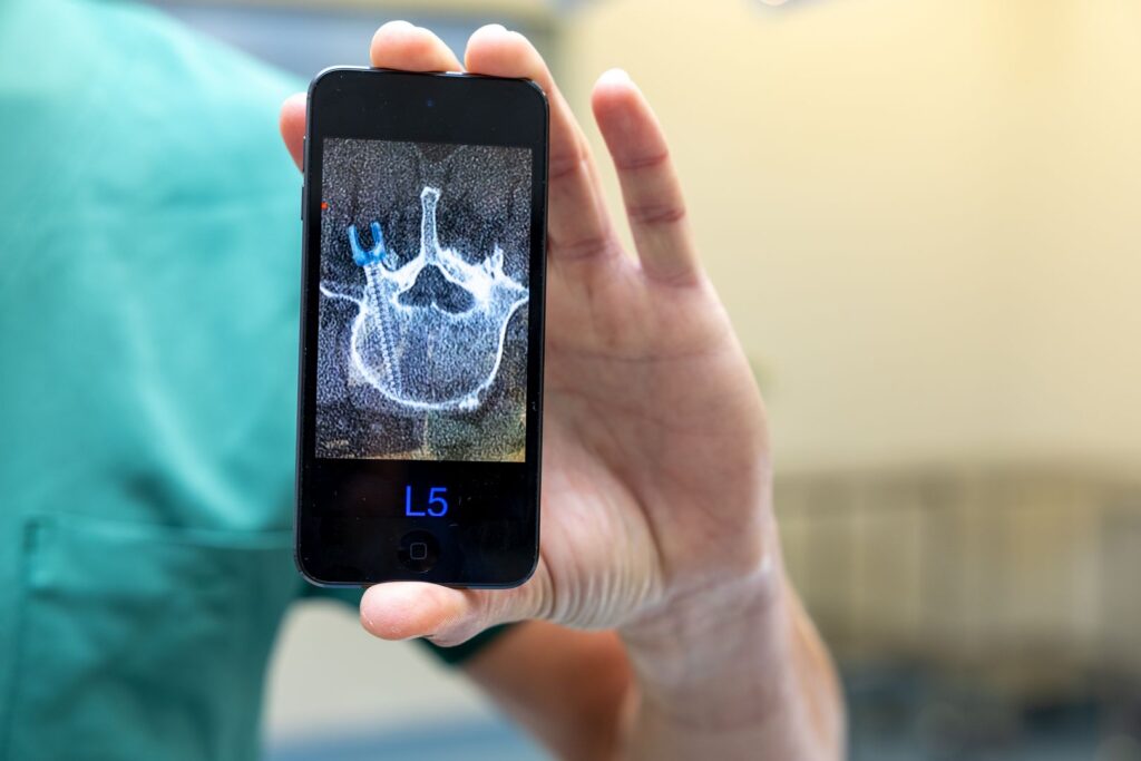 Om het nieuwe hulpmiddel te gebruiken worden in de app 2 foto’s geladen. De al bestaande MRI-foto van de patiënt en een actuele foto van de positie van de patiënt op de operatiekamer. In de app geeft de chirurg vervolgens aan in welke wervel de schroeven komen. De kunstmatige intelligentie (AI) in de app berekent dan een behandelplan. Mark: “Uiteraard bepaal je als chirurg met al je ervaring en beschikbare anatomische kennis de ingang en de richting van de schroef. Door groene en rode lijnen op het beeldscherm van de mobiele telefoon is te zien of de schroef in de goede richting wordt geplaatst in de wervel. Controle met de O-arm is niet meer nodig.”