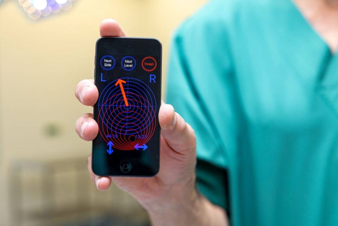 Met de software van het ‘handheld iOS based navigation device’ kun je als chirurg op de operatiekamer net als met de O-arm ook de juiste richting van de schroeven in de wervels bepalen.